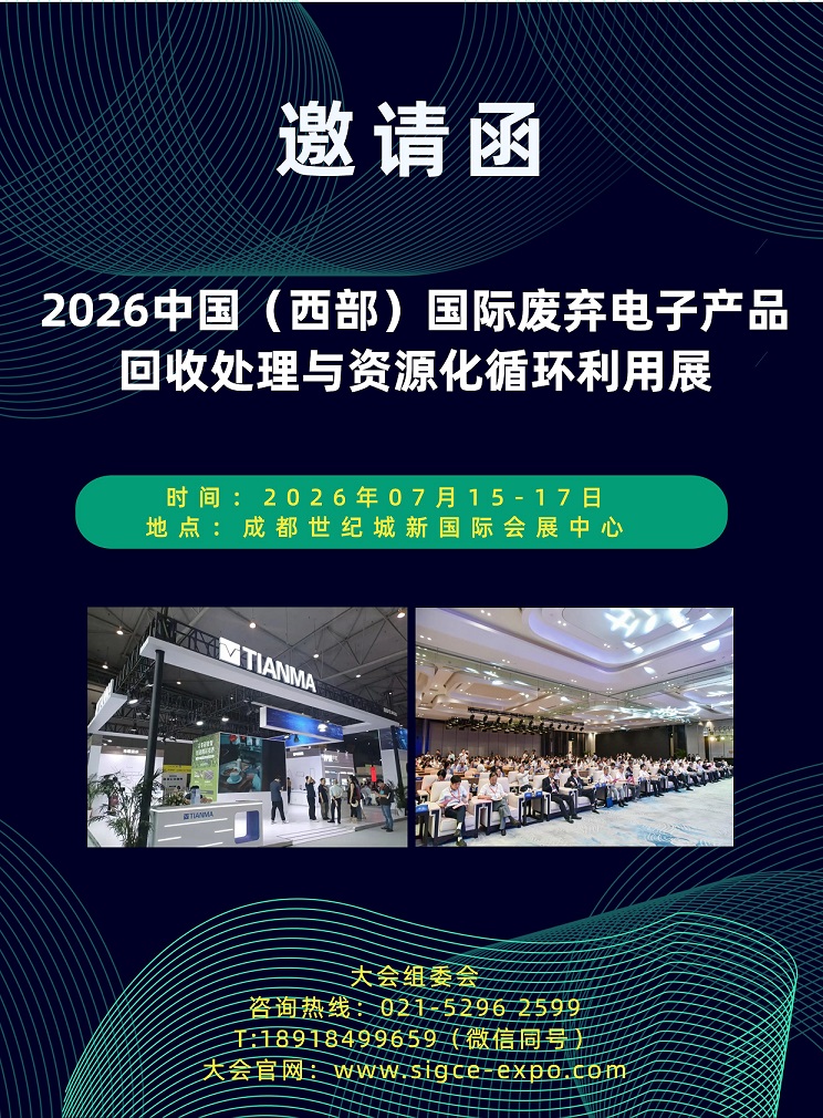 2026 第十四届中国(西部)国际废弃电器电子产品回收处理及资源化循环利用展览会将于2026年07月15日--17日在成都世纪城新国际会展中心隆重举办。展会同期还将举办多个系列专题展览、行业论坛及技术研讨会等配套活动,现场将重点展示国内外高端领域核心电子元器件、人工智能(AI应用)、具身智能装备、电子垃圾分类回收处理、电子垃圾智能分选装备\智能分拣机器人、电子废弃物拆解与破碎设备、电子垃圾智能称重系统、电子固废处理成套设备、电子生产自动化设备、电子智能制造设备与智能工厂、电子元器件生产加工设备、电子封装技术、半导体制造设备和材料、PCB 组装设备和材料、电子材料与制造专用设备、电子设计、电子制造与咨询服务、柔性电子材料、导电材料及印刷纸电池、混合废金属分选与综合利用、智能清洗技术及设备、废弃家电及电子电器产品再加工处理、电子产品回收利用与再制造技术、废旧电池(退役电池)回收处理、数字制造与5G智能工厂、智能测试、测量和检验设备、节能环保设备等前沿技术和研究成果,展会同期还将举办多个系列专题展区、技术演讲和颁奖配套活动。届时,来自全国各地的相关企业代表、专家学者、科研院校、行业组织/商学会、贸易客商及社会各界人士齐聚一堂,共同围绕废弃电器电子产品回收处理行业前沿技术、创新商业模式、政策解读等话题的热烈研讨。展会的举办,旨在为上下游企业、业界同仁、科研院校及相关从业人员提供一个研讨行业发展趋势、交流热点问题、共享研究成果和市场研判的重要平台,为加快构建覆盖全面、运转高效、规范有序的废弃物循环利用体系建设贡献行业智慧的力量。